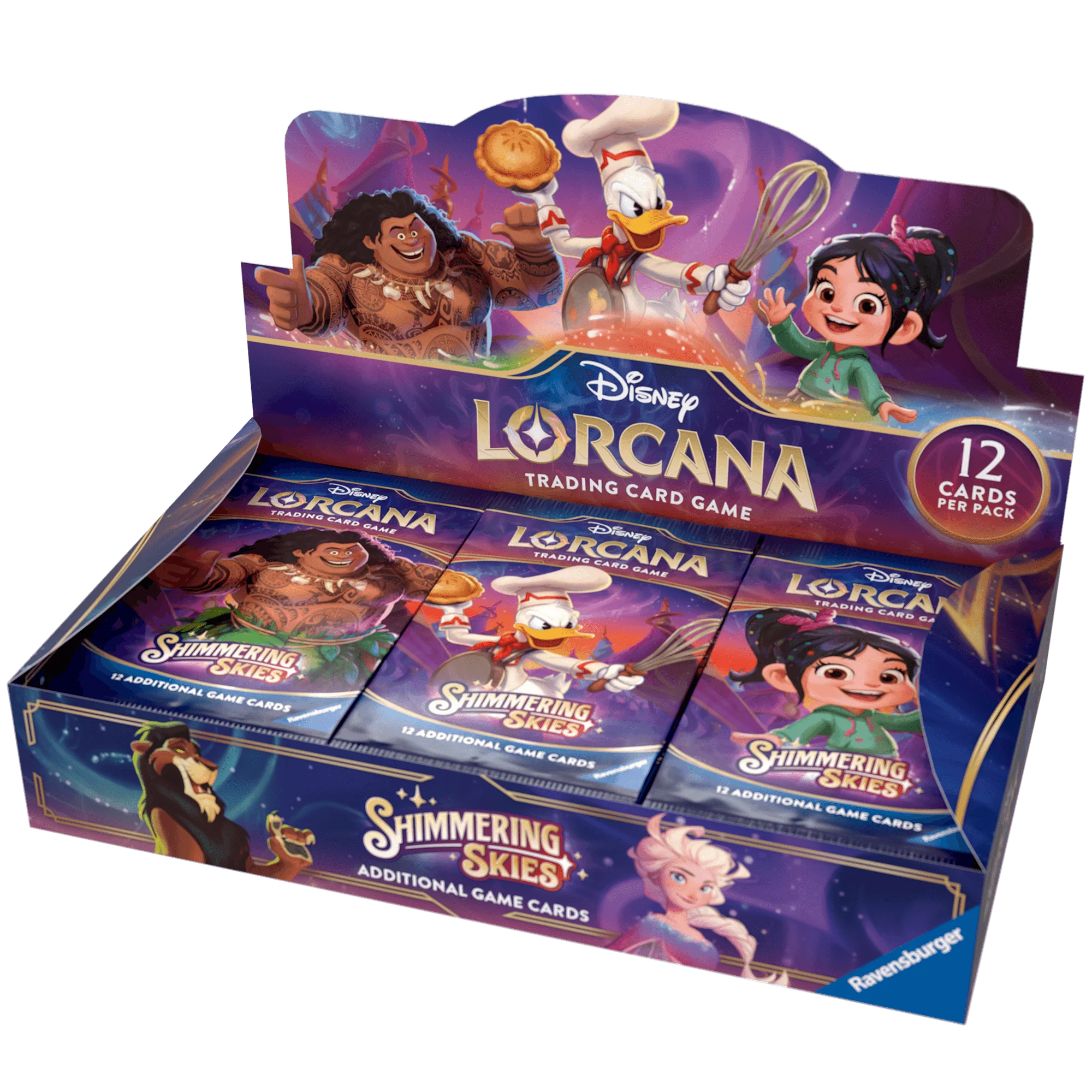 Each Booster Box contains 24 booster packs. Booster packs contain 12 random cards from the Disney Lorcana TCG set Shimmering Skies. Use booster packs to build and customize your deck with abilities and characters beyond those found in starter decks.