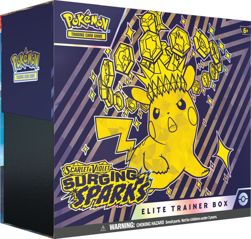 Each Surging Sparks Elite Trainer Box contains 9 Pokémon TCG: Scarlet & Violet—Surging Sparks booster packs and 1 full-art foil promo card featuring Magneton.