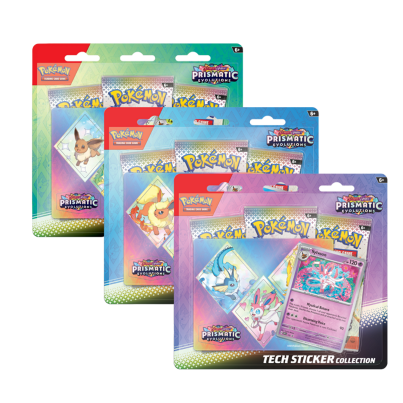The Pokémon TCG: Scarlet & Violet—Prismatic Evolutions Tech Sticker Collection includes:
