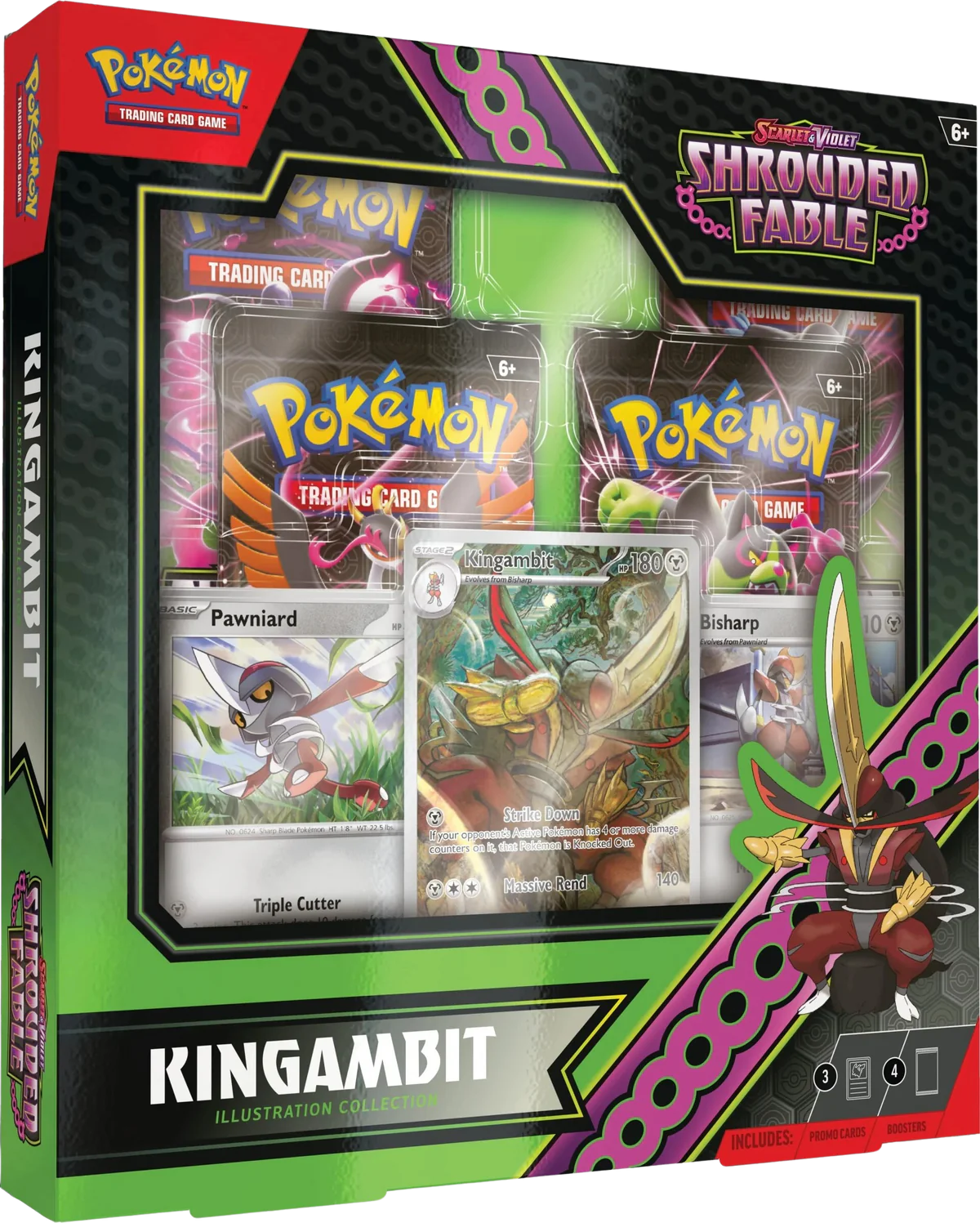 The Pokémon TCG: Scarlet & Violet—Shrouded Fable Kingambit Illustration Collection includes: