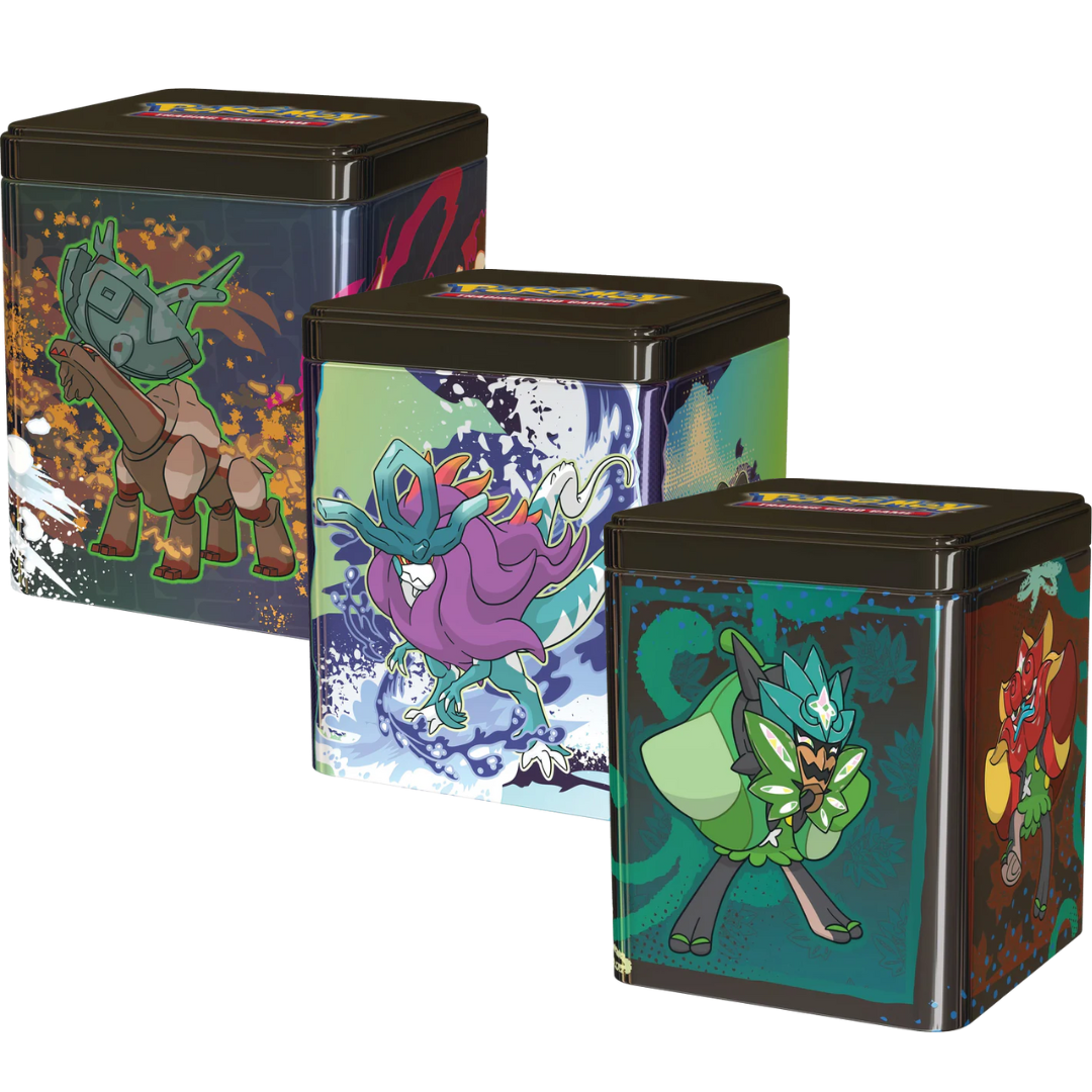 Choose a tin with powerful Pokémon from Paldea or Kitakami: the fearsome Treasures of Ruin, mysterious Paradox Pokémon, or feisty Ogerpon and its masks! This handy Pokémon TCG: Stacking Tin stacks neatly with others and each tin contains: