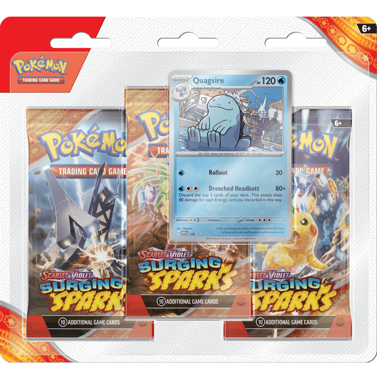 Terawatts of electricity crash down from the sky in a tropical paradise, setting the stage for the supercharged Pikachu ex! With the power of a Stellar Tera Pokémon ex, it lights up the shoreline, revealing a parade of dragon Pokémon led by the towering Alolan Exeggutor ex! Archaludon ex and Latias ex round out the horde, while new ACE SPEC cards and more new Pokémon ex bring surprises of their own. Currents crackle and Dragon types roar in the Pokémon TCG: Scarlet & Violet—Surging Sparks expansion!