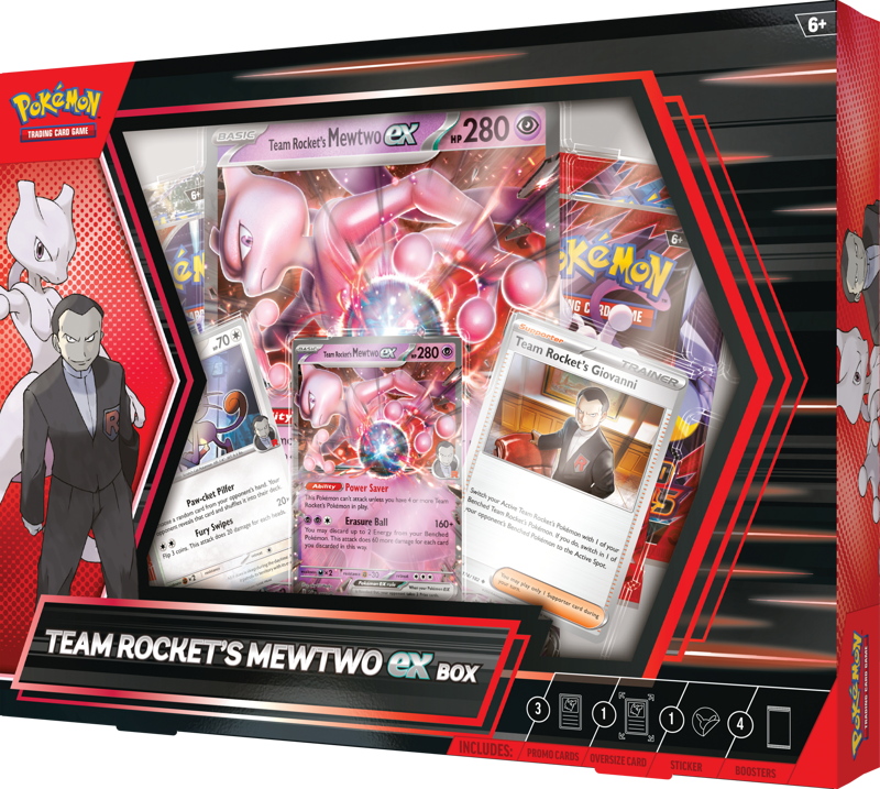 The Pokemon TCG: Team Rocket's Mewtwo ex Box includes: